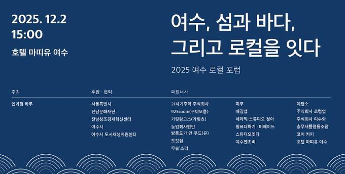 [ 중앙뉴스미디어 ] 여수시는 ‘연과점 하루’가 오는 12월 2일 오후 3시 마띠유호텔에서 ‘여수, 섬과 바다, 그리고 로컬을 잇다 - 2025 여수 로컬 포럼’을 개최한다고 밝혔다.