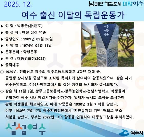 [ 중앙뉴스미디어 ] 여수시는 2025년 12월의 독립운동가로 전라남도 여천 삼산 덕촌 출신의 ‘박종문(朴鍾文)’ 선생을 선정했다.