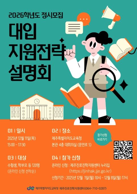 [ 중앙뉴스미디어 ] 제주특별자치도교육청은 12월 11일 오후 3시부터 본관 4층 대회의실에서 ‘2026학년도 대입 정시모집 지원전략 설명회’를 개최한다.
