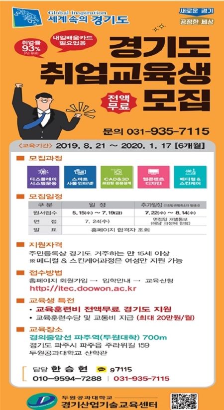 ‘경기산업기술교육센터’는 도내 산업체에 우수 기술인력을 공급하고, 청년 실업을 해소하고자 경기도가 두원공과대학교 파주캠퍼스에 위탁·운영 중인 맞춤형 취업교육기관이다.