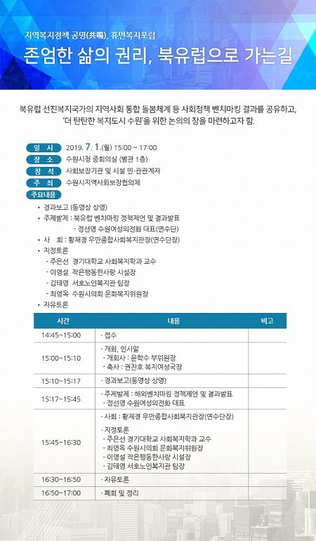 ‘존엄한 삶의 권리, 북유럽으로 가는 길’을 주제로 열리는 이번 포럼에서는 지난 5월 수원시 사회복지지설·기관 종사자 13명이 노르웨이·스웨덴·핀란드의 사회복지시설을 벤치마킹한 내용을 공유하고, 수원시 사회복지정책을 논의한다.
