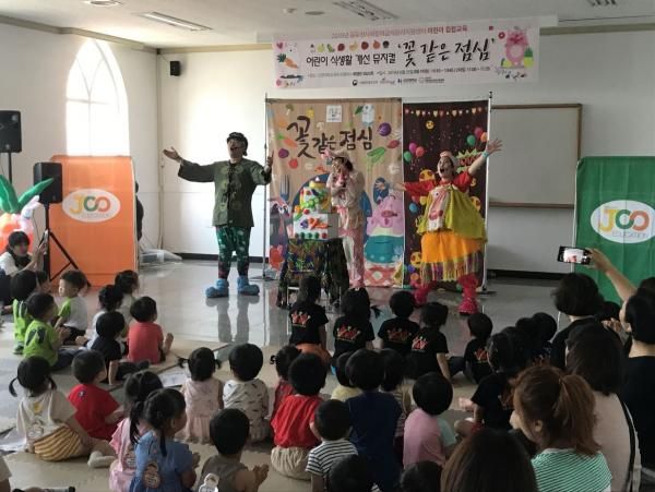 이번 뮤지컬 교육은 어린이들의 눈높이에 맞도록, 주인공인 아기토끼 캐릭터가 신선한 식재료 재료를 찾아 밭과 산으로 모험을 떠나는 내용으로 구성되어, 올바른 식사예절과 편식개선의 중요성을 익힐 수 있도록 진행되어, 큰 호응을 얻었다.