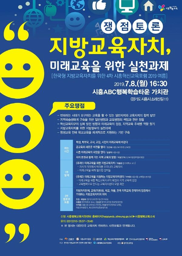 쟁점으로 논의한 결과는 여러 한계와 대안을 보완해 8월 8일 전국단위 ‘대한민국 교육자치 콘퍼런스’ 주제포럼에서 시흥시가 공론장을 이어갈 예정이다. 시흥시는 대한민국 어디에서도 정리되지 않았던 지방교육자치가 어떻게 지역교육의 전면적인 성장을 일궈나갈 것인가에 대한 길을 꾸준히 찾아나갈 계획이다.