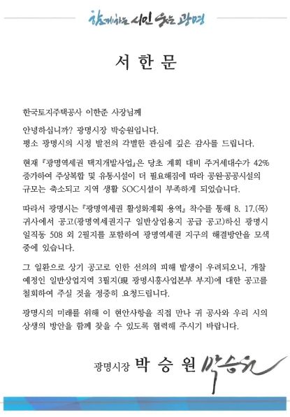 박 시장은 이날 이 사장에게 전달한 서한문을 통해 LH가 추진하고 있는 광명역세권 일직동 부지 매각을 취소해달라고 요청하고 당초 계획과 달리 주거 위주로 개발돼 생활SOC가 턱없이 부족한 광명역세권 지구 문제 해결을 위해 직접 만나 상생방안을 모색하자고 밝혔다.