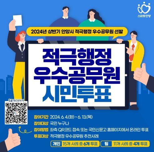 투표 기간은 이달 4일부터 13일까지이며, 안양시민 뿐 아니라 국민 누구나 국민생각함 홈페이지에서 ‘안양시 적극행정’을 검색하면 참여할 수 있다.