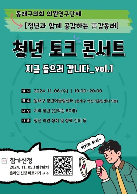 이번 토크콘서트는 동래구 청년 누구나 참여할 수 있으며, 사전 예약과 현장 접수 모두 가능하다. 사전 예약은 토크콘서트 포스터의 큐알(QR)코드를 통해 신청하면 된다,