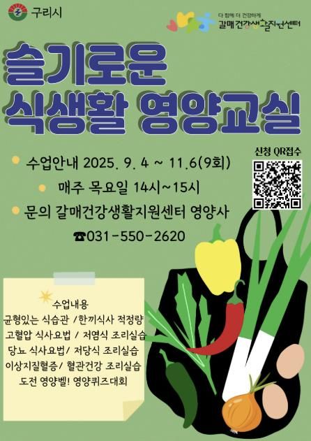 백경현 구리시장은 “건강한 삶의 기본은 올바른 먹거리에서 시작된다.”라며, “앞으로도 시민들의 건강한 식생활 실천을 돕기 위한 다양한 영양교육 프로그램을 지속적으로 확대해 나가겠다.”라고 밝혔다.