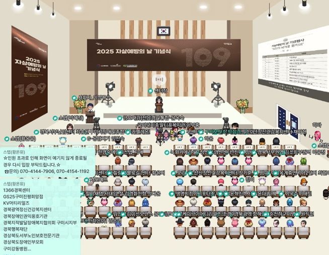 [ 중앙뉴스미디어 ] 구미시는 정신건강과 자살예방의 중요성을 알리기 위해 지난 1일 메타버스 플랫폼(ZEP) ‘구미정신건강월드’에서 '제13회 자살예방의 날 기념행사-희망의 날개를 펼치며'를 개최했다.