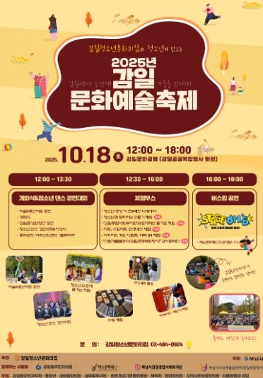 [ 중앙뉴스미디어 ] 하남시 감일청소년문화의집은 오는 10월 18일 오후 12시부터 18시까지 감일문화공원(감일공공복합청사 뒷편)에서 '제2회 감일문화예술축제'를 개최한다.