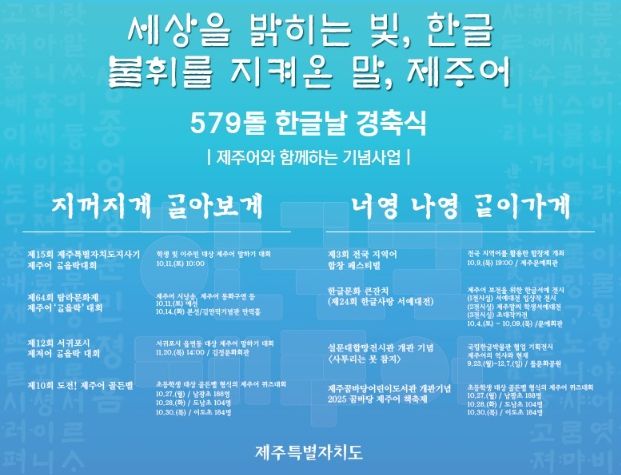 [ 중앙뉴스미디어 ] 제주특별자치도는 훈민정음 반포 579돌 한글날을 맞이해 오는 9일 오전 10시 제주문예회관에서 한글날 경축식을 개최한다.
