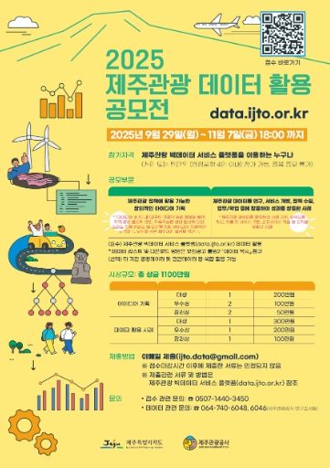 [ 중앙뉴스미디어 ] 제주특별자치도와 제주관광공사는 오는 11월 7일까지 온라인 채널을 통해 ‘2025년 제주관광 데이터 활용 공모전’ 참가자를 모집하고 있다고 2일 밝혔다.
