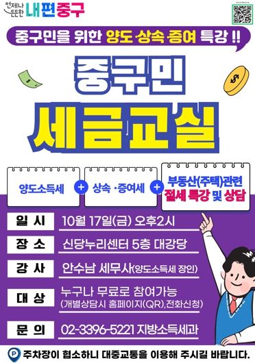 [ 중앙뉴스미디어 ] 서울 중구가 어렵게만 느껴지는 세금에 대한 이해를 돕기 위해 오는 17일 오후 2시 신당누리센터 5층 대강당에서 '중구민 세금교실' 특강을 연다.