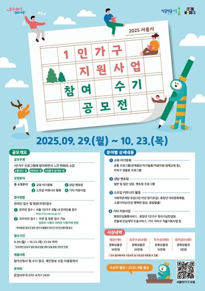 [ 중앙뉴스미디어 ] 서울시가 1인가구 지원사업의 성과를 공유하고 참여자들의 생생한 목소리를 담아내기 위해 '2025년 1인가구 지원사업 참여 수기 공모전'을 개최한다.