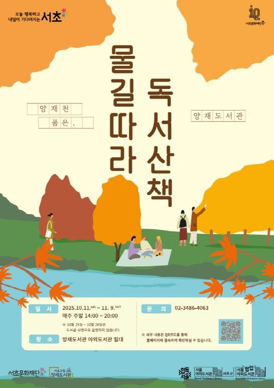 [ 중앙뉴스미디어 ] 서울 서초구에서는 가을의 시원한 바람을 느끼며 독서의 즐거움을 만끽할 수 있을 전망이다. 서초구립양재도서관은 오는 11일부터 11월 9일까지 매주 토, 일요일에 ‘오솔숲 야외도서관’과 양재천변에서 '양재천 품은 양재도서관'을 운영한다고 밝혔다.