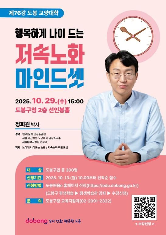 [ 중앙뉴스미디어 ] 서울 도봉구가 10월 13일 오전 10시부터 ‘저속노화 마인드셋’ 특강 참여자를 모집한다.