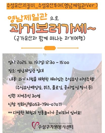 [ 중앙뉴스미디어 ] 수성구자원봉사센터 소속 수성유산지킴이는 오는 19일 영남제일관 일대에서 지역 주민을 대상으로 한 문화 체험 프로그램 ‘영남제일관으로 과거 보러 가세’를 진행한다.