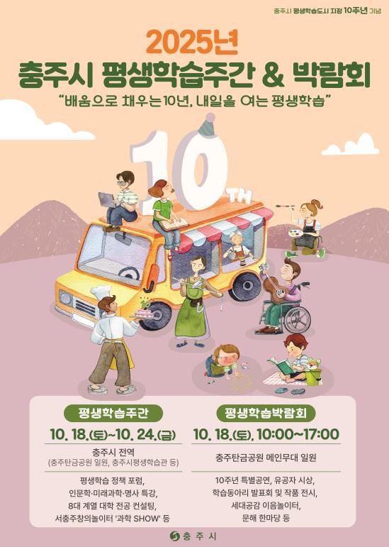 [ 중앙뉴스미디어 ] 충주시는 평생학습도시 지정 10주년을 맞아 오는 18일부터 24일까지 '2025년 충주시 평생학습주간'을 개최한다고 14일 밝혔다.