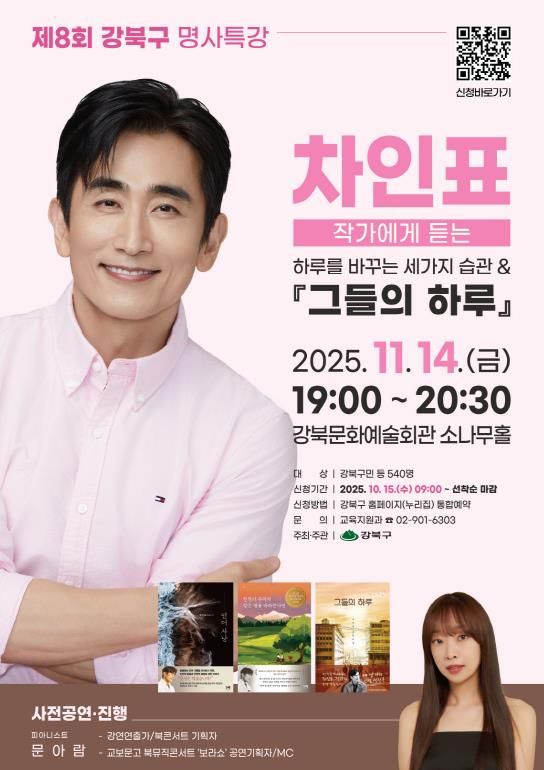[ 중앙뉴스미디어 ] 서울 강북구는 오는 11월 14일 오후 7시 강북문화예술회관 강북소나무홀에서 배우이자 작가로 활동 중인 차인표 작가를 초청해 ‘제8회 강북구 명사특강’을 개최한다.