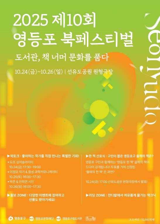 한편 오는 10월 24일부터 26일까지 선유도공원에서 ‘제10회 영등포 북페스티벌’이 열린다. 이번 축제는 영등포 대표 지역축제인 ‘선유도원 축제’와 연계해 진행되며, 선선한 가을 바람 속에서 특별한 독서의 즐거움을 느낄 수 있다. 자세한 사항은 구청 미래교육과 또는 영등포구립도서관으로 문의하면 된다.