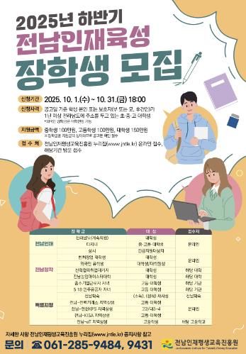 [ 중앙뉴스미디어 ] 전라남도와 전남인재평생교육진흥원은 실질적인 교육기회 보장과 미래인재로의 성장, 지역 정착을 지원하기 위한 2025년 하반기 전남인재육성 장학생을 오는 31일까지 모집한다.