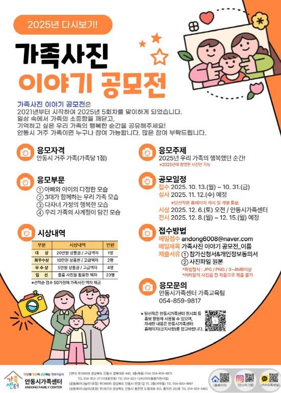 유하영 안동시가족센터장은 “안동시가족센터가 지역 내 가족들과 한 걸음 더 가까이 다가갈 수 있는 한해였다. ‘2025년 다시보기! 가족사진 이야기 공모전’을 통해 가족의 소중함을 깨닫고 진정한 가족의 의미를 되새기는 발판이 되길 바란다”고 말했다.