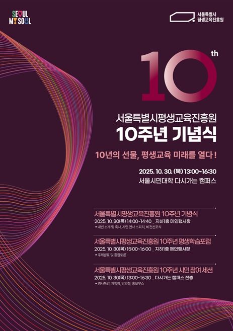 [ 중앙뉴스미디어 ] 서울시평생교육진흥원이 설립 10주년을 맞아 오는 10월 30일 서울시민대학 다시가는 캠퍼스에서 '서울시평생교육진흥원 10주년 기념식'을 개최한다. 이번 행사는 지난 10년의 성과를 되짚고 미래 비전을 제시하는 자리를 넘어, 시민이 직접 참여하고 즐기는 다채로운 축제의 장으로 마련된다.