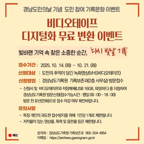 [ 중앙뉴스미디어 ] 경상남도기록원은 10월 14일부터 31일까지 도민이 소중한 추억을 오래도록 보존할 수 있도록 '빛바랜 기록 속 찾은 소중한 순간 – 다시 빛날 기록'이라는 주제로 비디오테이프 디지털 변환 이벤트를 추진한다고 밝혔다.