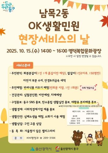 [ 중앙뉴스미디어 ] 울산 동구는 오는 10월 15일 오후 2시부터 4시까지 명덕복합문화광장에서 ‘남목2동 OK생활민원 현장서비스의 날’ 행사를 개최한다.