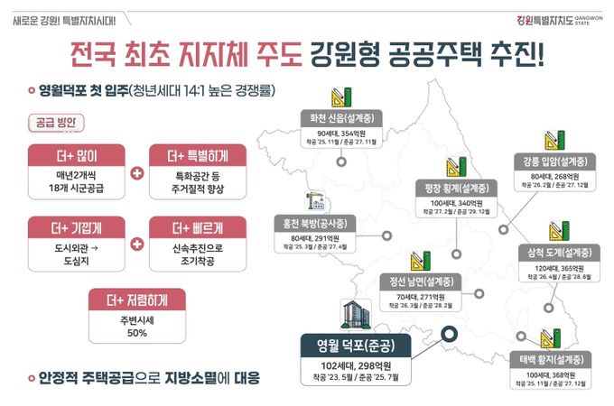 [ 중앙뉴스미디어 ] 강원특별자치도는 청년과 신혼부부 등 지역 정착 인구 확대를 위한 안정적인 주택공급을 목표로 전국 최초의 지자체 주도형 주거모델인 강원형 공공주택 사업을 적극 추진하고 있다고 밝혔다.