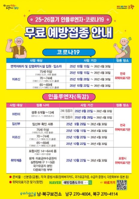 [ 중앙뉴스미디어 ] 포항시는 오는 15일부터 2025~2026절기 고위험군 대상 코로나19 예방접종을 실시한다고 밝혔다.