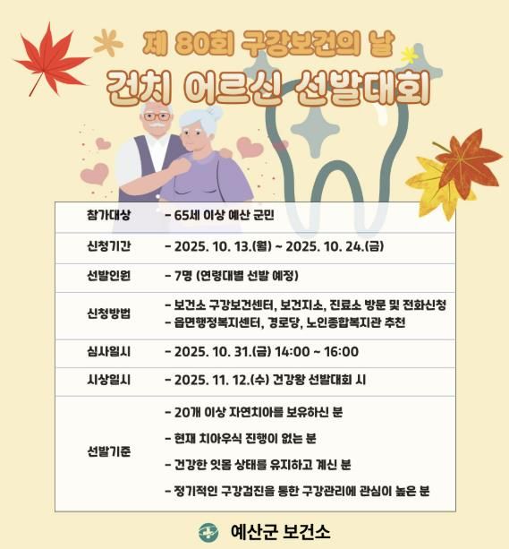 [ 중앙뉴스미디어 ] 예산군보건소는 ‘제80회 구강보건의 날’을 맞아 건강하고 활기찬 구강생활 실천 분위기 조성을 위해 건치(건강한 치아)어르신 선발대회를 개최한다.