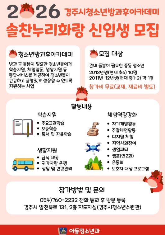 [ 중앙뉴스미디어 ] 경주시청소년방과후아카데미 ‘솔찬누리화랑’은 오는 20일부터 2026년도 참가자 12명을 모집한다.