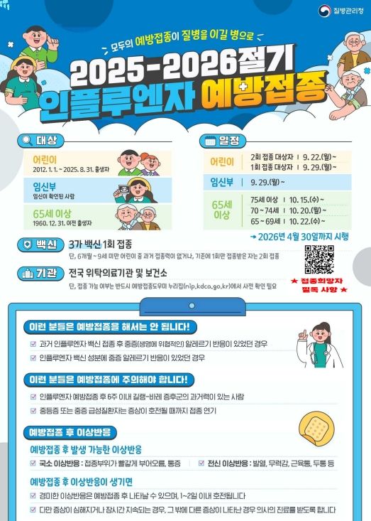 인플루엔자 국가예방접종 대상은 생후 6개월~13세 이하 어린이(2012년 1월 1일~2025년 8월 31일 출생자), 임신부, 65세 이상 어르신(1960년 12월 31일 이전 출생자)이다.