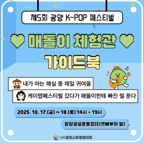 [ 중앙뉴스미디어 ] 광양시는 ‘제5회 광양 K-POP 페스티벌’의 사전 열기를 확산하고 시민과 관광객이 함께 만들어가는 지속가능한 축제문화를 조성하기 위해 ‘매돌이 체험관’ 운영 및 ‘기대평 이벤트’를 추진한다고 밝혔다.