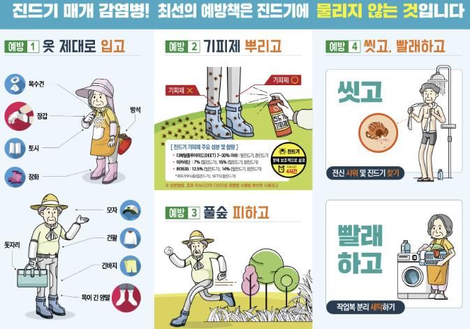 또한 진드기 기피제를 사용하고, 야외활동 후에는 입은 옷을 세탁하고 바로 샤워하는 것이 좋다.