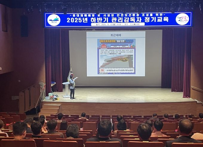 [ 중앙뉴스미디어 ] 예산군은 지난 13일 군청 추사홀에서 중대재해 예방과 안전한 근로환경 조성을 위해 ‘2025년 하반기 관리감독자 집체교육’을 실시했다고 밝혔다.