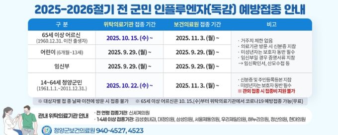 ▲14~64세 청양군민은 오는 22일부터 위탁의료기관, 11월 3일부터 보건의료원에서 무료 접종하며 백신 소진 시까지 진행한다.