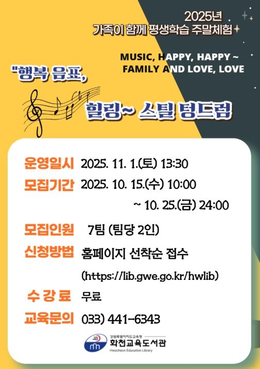 [ 중앙뉴스미디어 ] 강원도교육청 화천교육도서관은 군민을 대상으로 2025년 11월 평생학습 주말체험 ‘늦가을, 가족 음악 특강: 행복 음표, 힐링 스틸 텅드럼’을 운영한다.