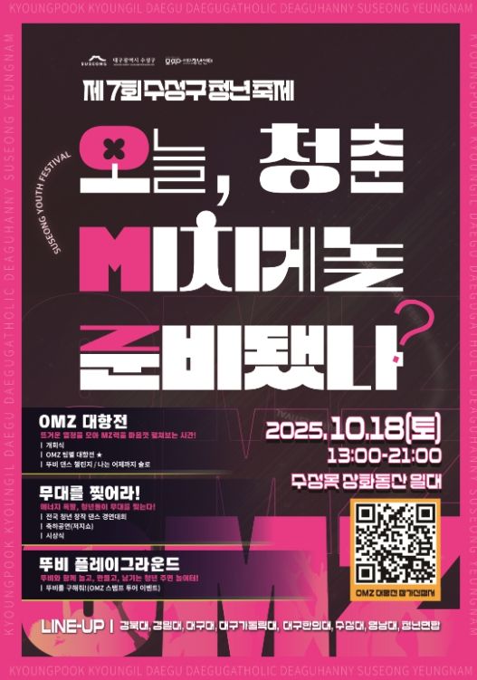 [ 중앙뉴스미디어 ] 대구 수성구는 오는 18일 수성못 상화동산 일대에서 ‘2025 제7회 수성구 청년축제’를 개최한다.