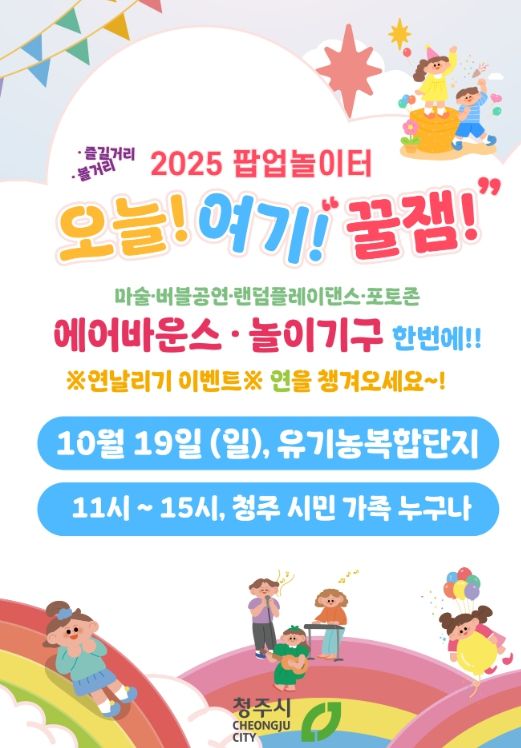 [ 중앙뉴스미디어 ] 청주시는 오는 18일 개최 예정이었던 팝업 놀이터 ‘오늘! 여기! 꿀잼’을 비 예보로 인해 19일 오전 11시부터 오후 3시까지 유기농복합단지에서 운영한다고 밝혔다.