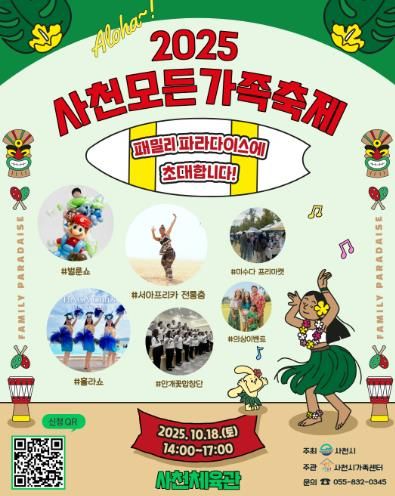사천시가 주최하고 사천시가족센터가 주관하는 ‘2025 사천모든가족축제’에 대한 자세한 사항은 여성가족과 또는 사천시가족센터로 문의하면 된다.