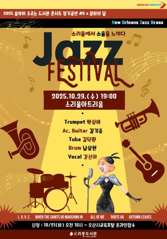 [ 중앙뉴스미디어 ] 경기도 오산시는 오는 10월 29일 오후 7시, 소리울도서관 3층 소리울아트리움에서 '2025 음악이 흐르는 도서관 콘서트 정기공연 #6 × 문화의 달 – Jazz Festival; 소리울에서 소울을 느끼다'를 개최한다고 밝혔다.