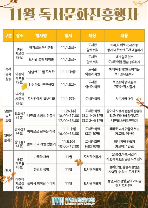 [ 중앙뉴스미디어 ] 사천시는 사천시립도서관에서 11월 한 달 동안 책과 함께 여유로운 시간을 보내며 감성을 채울 수 있는 다양한 독서문화행사와 체험 프로그램을 운영한다고 17일 밝혔다.