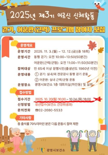 참여 대상은 2025년 기준 만 65세 이상(1960년 이전 출생자) 광명시민이다. 참여를 희망하는 시민은 10월 20일부터 23일까지 광명시보건소 건강위생과 건강증진팀에 유선으로 신청하면 된다.