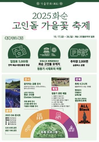 [ 중앙뉴스미디어 ] 화순군은 10월 17일부터 10월 26일까지 10일간 개최되는 ‘2025 화순 고인돌 가을꽃 축제’에서 통합문화이용권(문화누리카드)으로 결제가 가능한 임시 가맹점 46개소를 운영한다고 밝혔다.