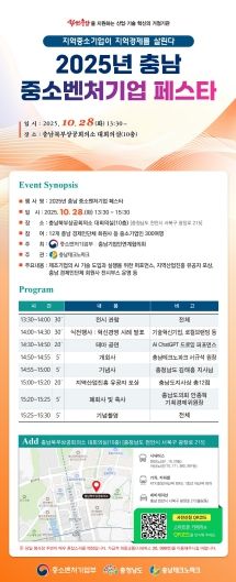 [ 중앙뉴스미디어 ] (재)충남테크노파크(원장 서규석)는 도내 중소벤처기업의 혁신 성장과 상생 네트워크 강화를 위해 '2025 충남 중소벤처기업 페스타'를 28일 충남북부상공회의소 10층 대회의실에서 개최한다고 밝혔다.