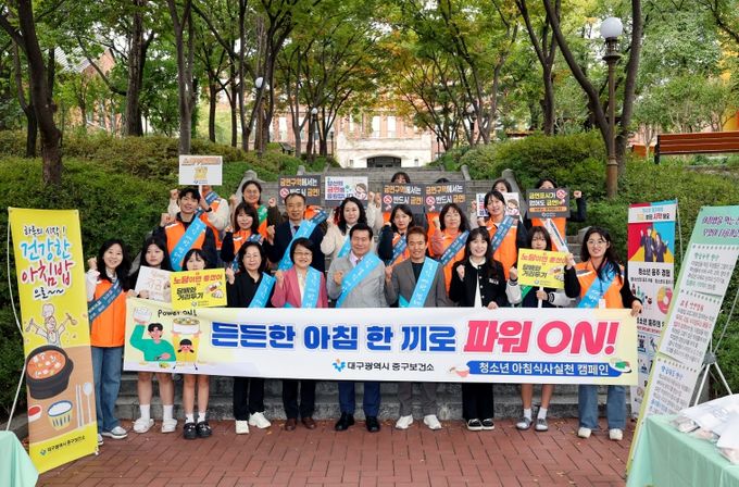 [ 중앙뉴스미디어 ] 대구 중구는 ‘건강한 배움터 만들기’사업의 일환으로 10월 21일 오전 07:50경 계성중학교(달성로 35)에서 학생들의 등굣길에 전교생 및 교직원 700여 명을 대상으로 청소년 아침식사 실천 캠페인'든든한 아침 한 끼로 파워 ON'을 실시했다.