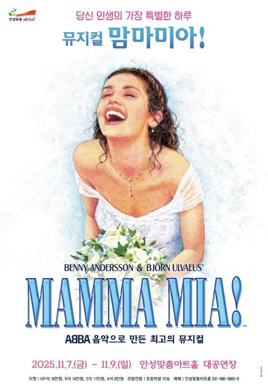 [ 중앙뉴스미디어 ] 안성맞춤아트홀은 오는 11월 7일부터 9일까지 대공연장에서 세계적인 히트 뮤지컬 '맘마미아!'를 무대에 올린다. 세대를 초월한 명곡과 유쾌한 스토리로 사랑받아온 이번 작품은 남녀노소 누구나 즐길 수 있는 최고의 힐링 뮤지컬이다.