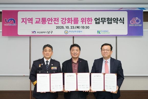 [ 중앙뉴스미디어 ] 부산 남구는 지난 10월 23일, 부산 남부경찰서 및 도로교통공단 부산광역시지부와 함께‘지역 교통안전 강화를 위한 업무협약’을 체결했다고 밝혔다.