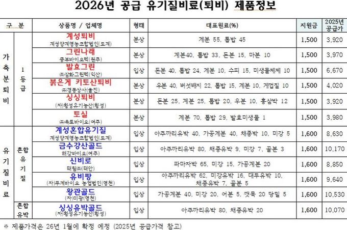 지원 품목은 유기질비료(가축분퇴비/1등급) 포당 1,500원, 유기질비료(혼합유기질) 포당 1,600원 으로 구매보조금이 정액 지원된다.